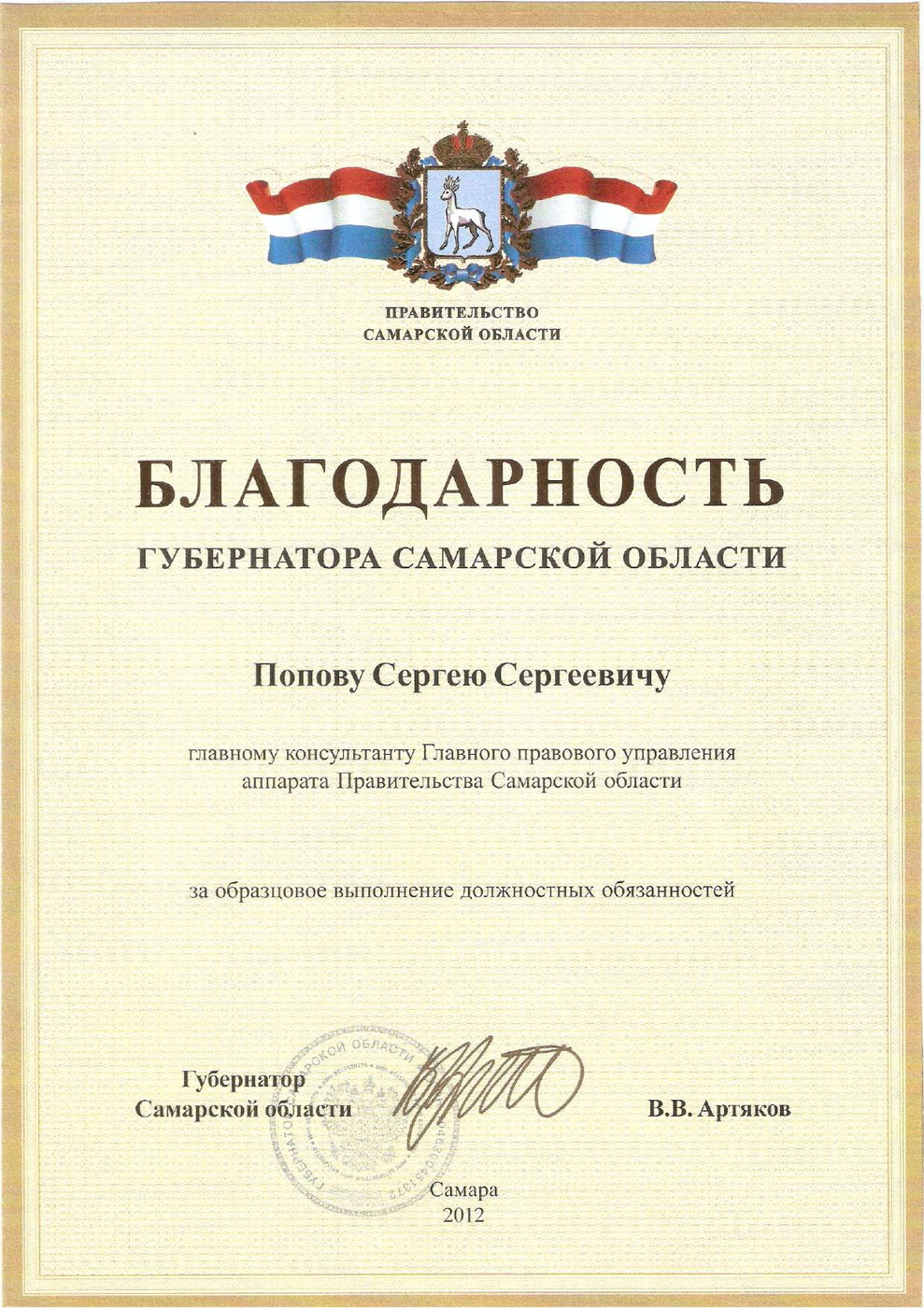 награжден Благодарностью Губернатора Самарской области